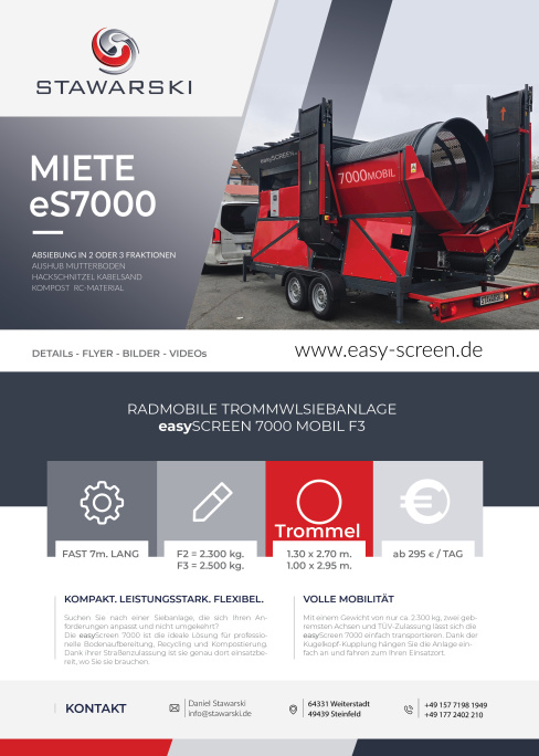 Suchen Sie nach einer Siebanlage, die sich Ihren Anforderungen anpasst und nicht umgekehrt? Die easyScreen 7000 ist die ideale Lösung für professionelle Bodenaufbereitung, Recycling und Kompostierung. Dank ihrer Straßenzulassung ist sie genau dort einsatzbereit, wo Sie sie brauchen.
